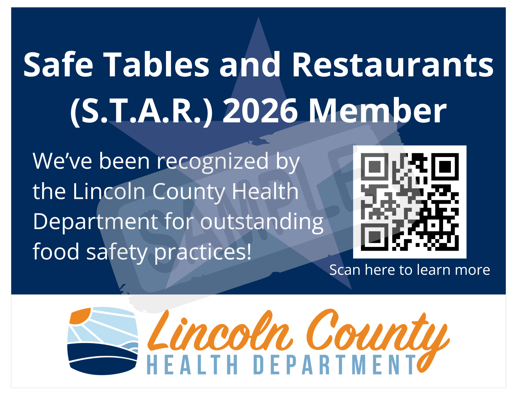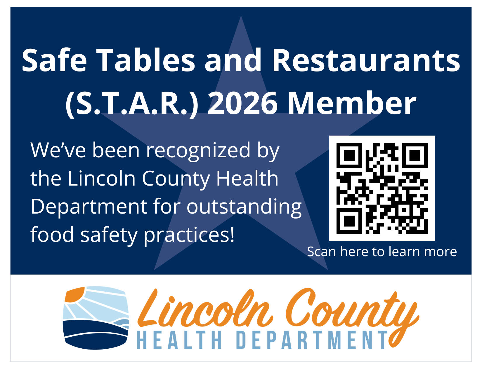 Lincoln County S.T.A.R. is a food safety incentive program designed to recognize local food establishments that demonstrate outstanding food safety practices by meeting criteria established by the Lincoln County Health Department (LCHD).